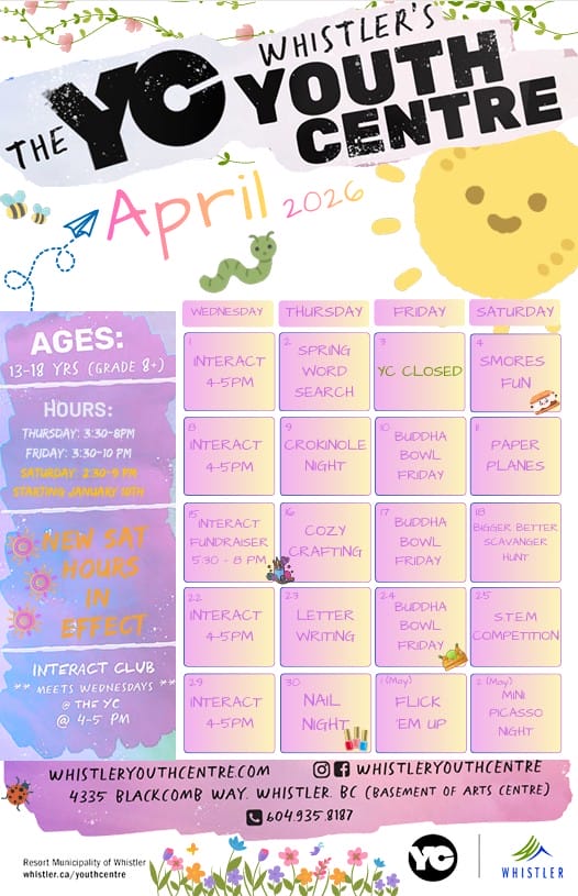 The Interact Club of Whistler, a Whistler Rotary initiative, is for youth ages 12 to 18. The group meets every Wednesday in The YC during the school year from 4 to 5 p.m. For more information e-mail the club at whistlerinteract@gmail.com or follow them on Instagram.