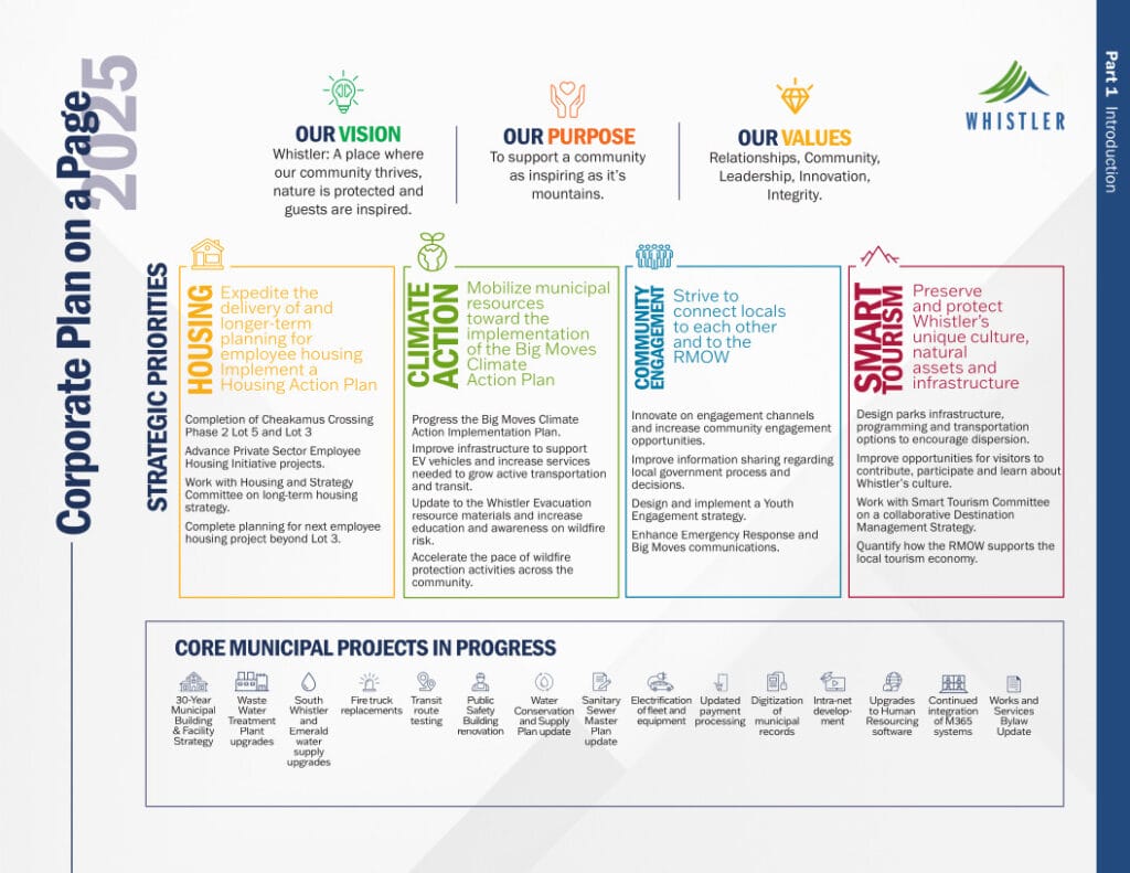 The 2023–2026 Resort Municipality of Whistler Strategic Plan outlines strategic priorities for this term of Council. These core areas are identified as vital to the community and are drawn from feedback during the 2022 election campaign, existing municipal initiatives and strategic planning discussions. The Strategic Plan, along with core municipal projects and services, provide the framework for the more detailed Corporate Plan and Annual Report.