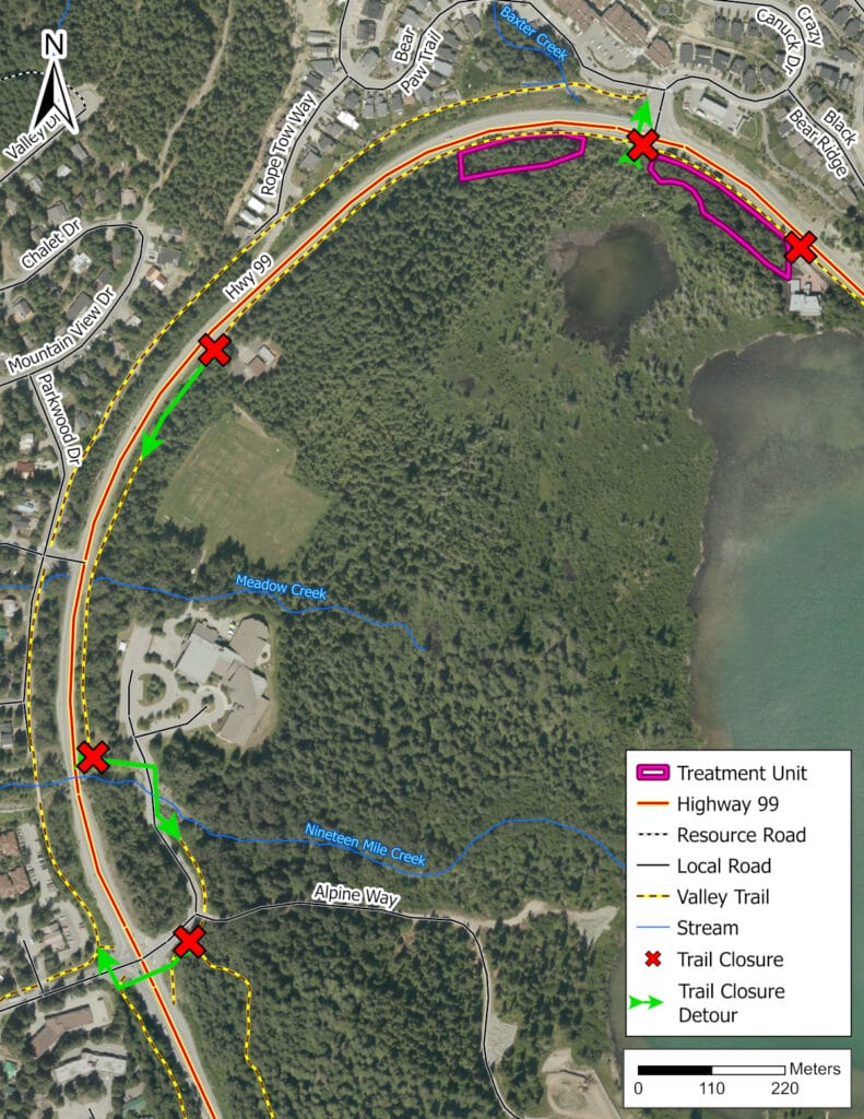 Wildfire fuel management is underway on the north end of Alta Lake Road in map area unit 1. Some trails in the area will have temporary closures: please respect all signs and staff for safety reasons.